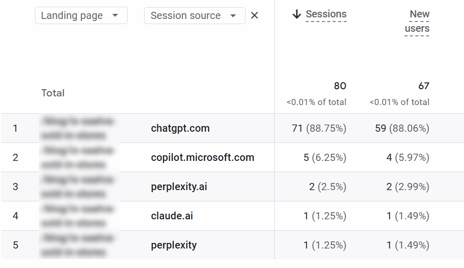 LLM tracking is still messy, but you don’t need perfect attribution to see impact. A basic referral source report showed direct LLM traffic landing on the page.