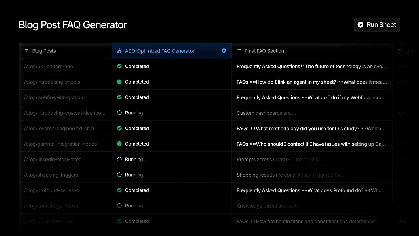 Sheets is the new connective layer for your marketing program. Profound data flows in, Agents do the work, and content flows out to your CMS. Here’s what you can build: