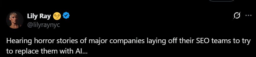 And let’s be clear: this isn’t just AI replacing “lazy SEOs.” Nobody is safe when leadership gets addicted to cost-cutting.