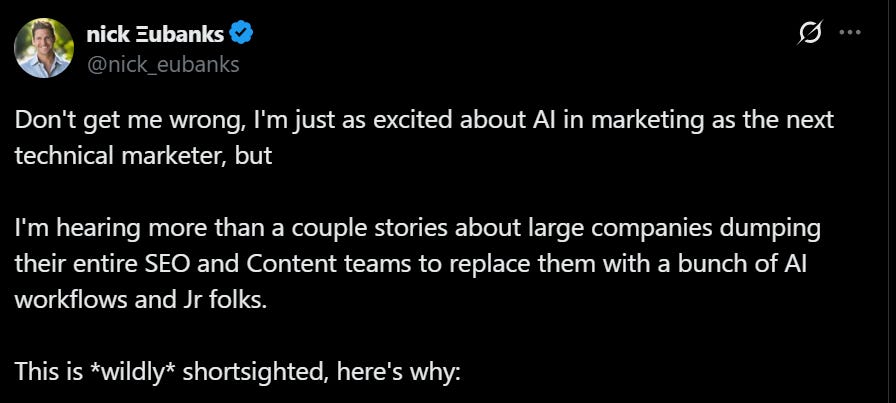 Nick Eubanks echoed the same trend: entire SEO and content departments were cut, replaced by AI workflows, and junior staff.