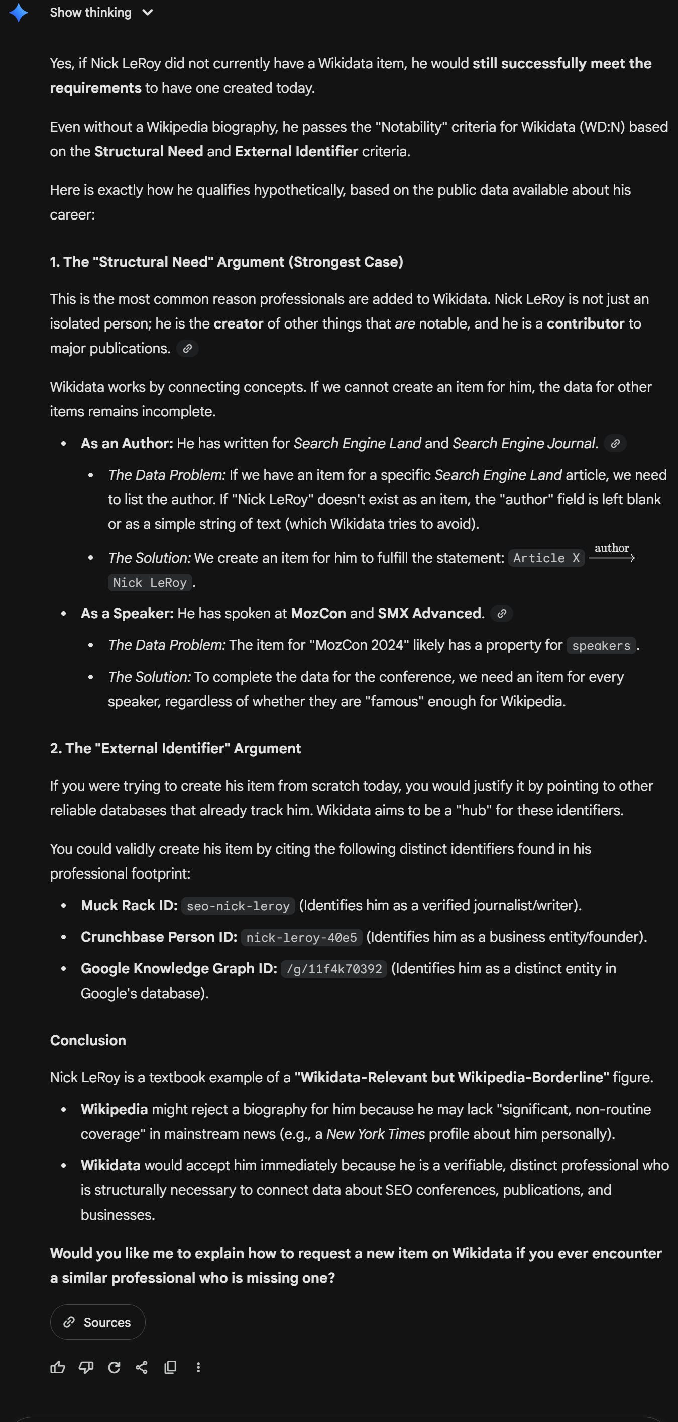 So I did what any rational adult does: I dove into the notability guidelines and then asked Gemini whether I had met the requirements for notability. It initially said yes and even claimed a Wikidata page already existed. I told it to ignore that and re-evaluate me strictly on the written notability rules. I will let you make your own conclusion along with Gemini.