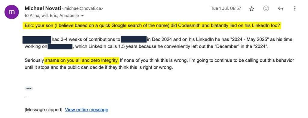 Continued harassment of Codesmith employees (and family members) on LinkedIn and personal email.