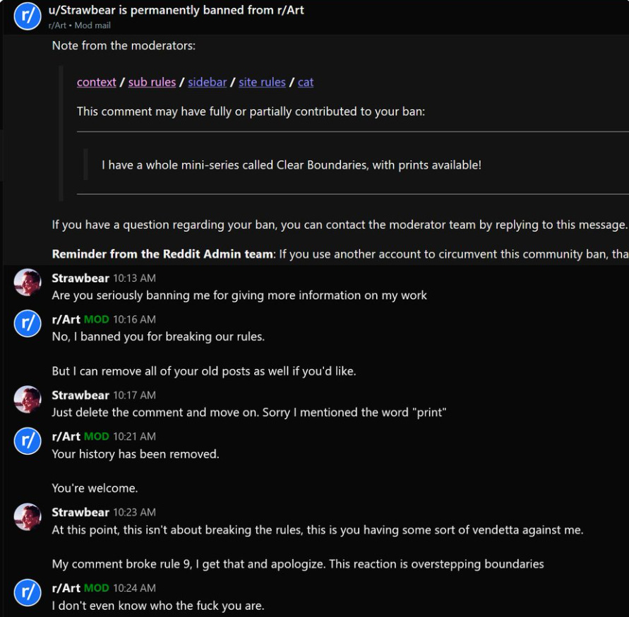 The head moderator decides this is the hill to die on. He hits the perma ban (permanent) button, then casually offers to delete the artist’s entire posting history. When Clay questions the decision and apologizes for the rule break, the mod doubles down in mod mail, ending with “I don’t even know who the fuck you are.”
