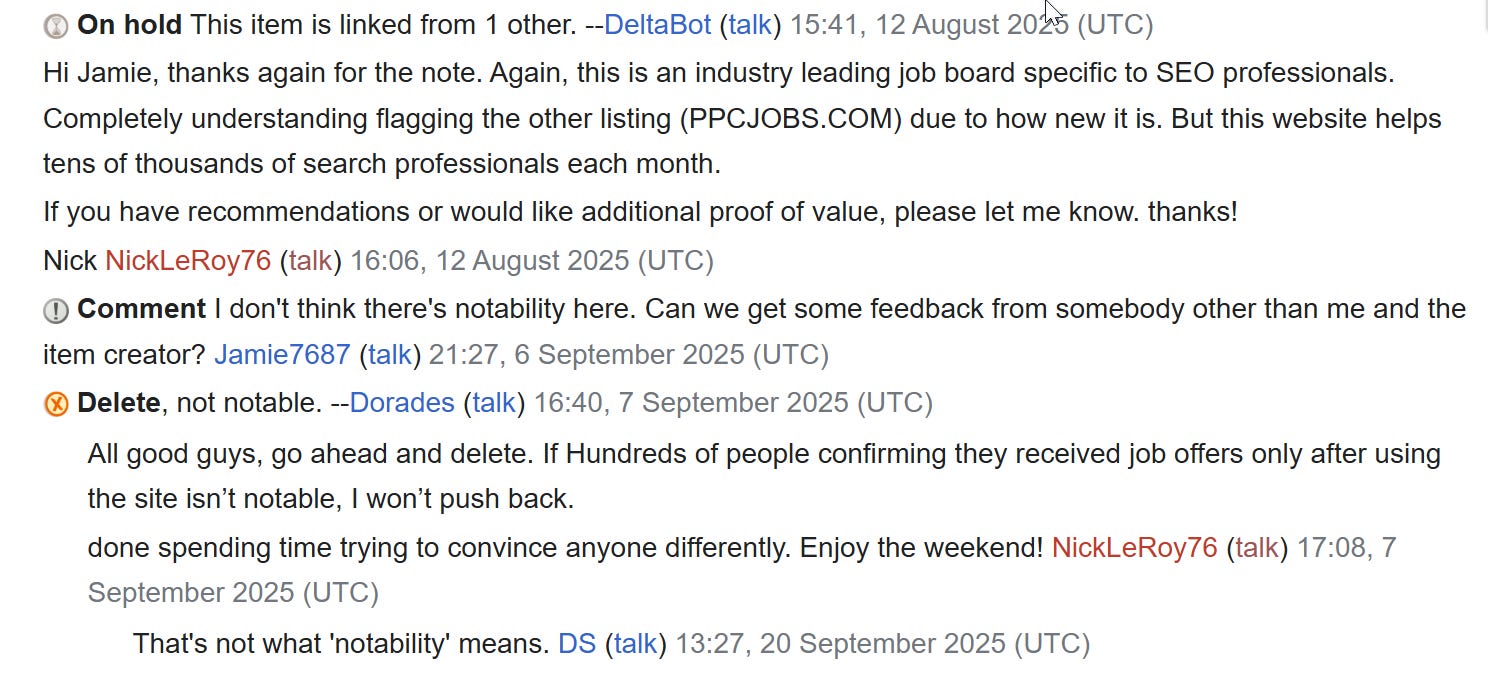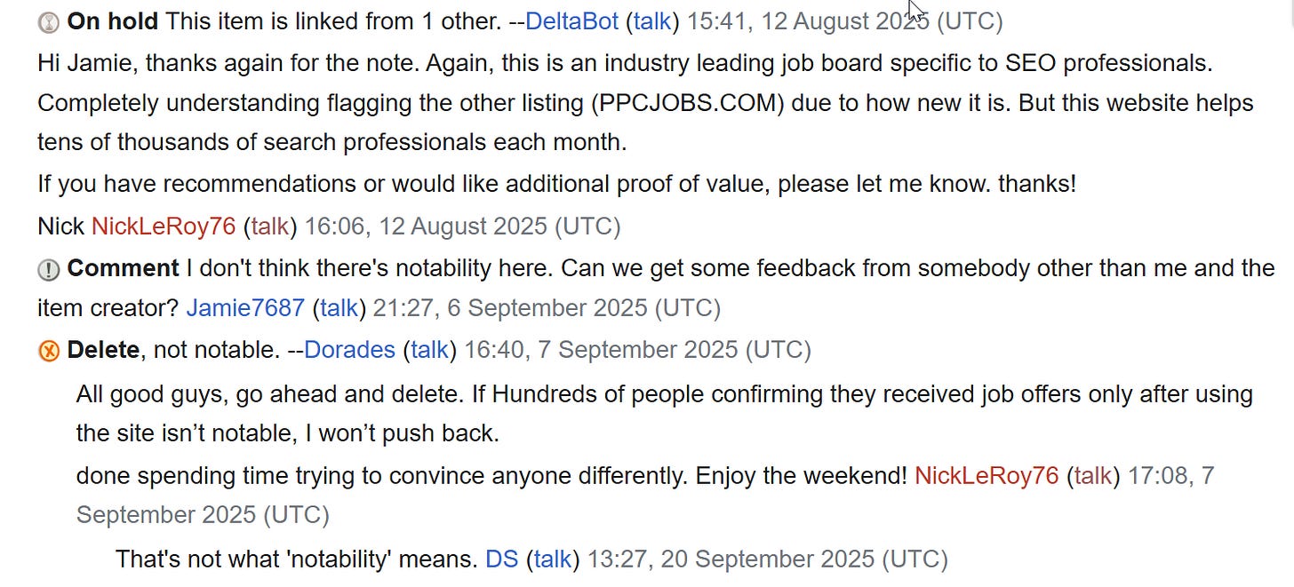 Next, the SEOJobs.com page gets tagged for deletion as promotional and not notable. I tried again with another mod, got a little snarky once it was clear I was not going to win, and they killed the page. At that point, my entity and SEOForLunch pages were still standing, so I left them. I thought we had landed on some “reasonable middle.”