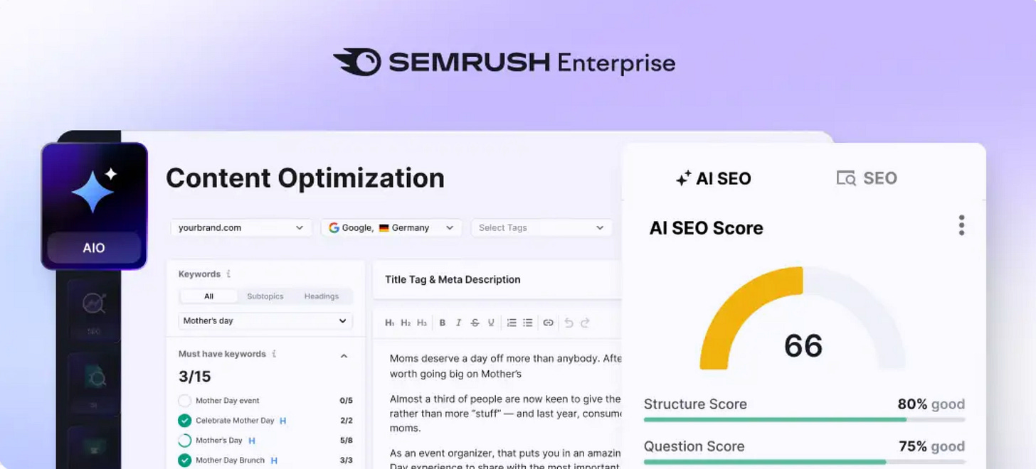 Semrush Enterprise AIO’s new Content Optimization capabilities give you real-time scoring for relevance, cluster coverage, and structure as you write. You also get guided steps to improve each factor, with live feedback that updates instantly.