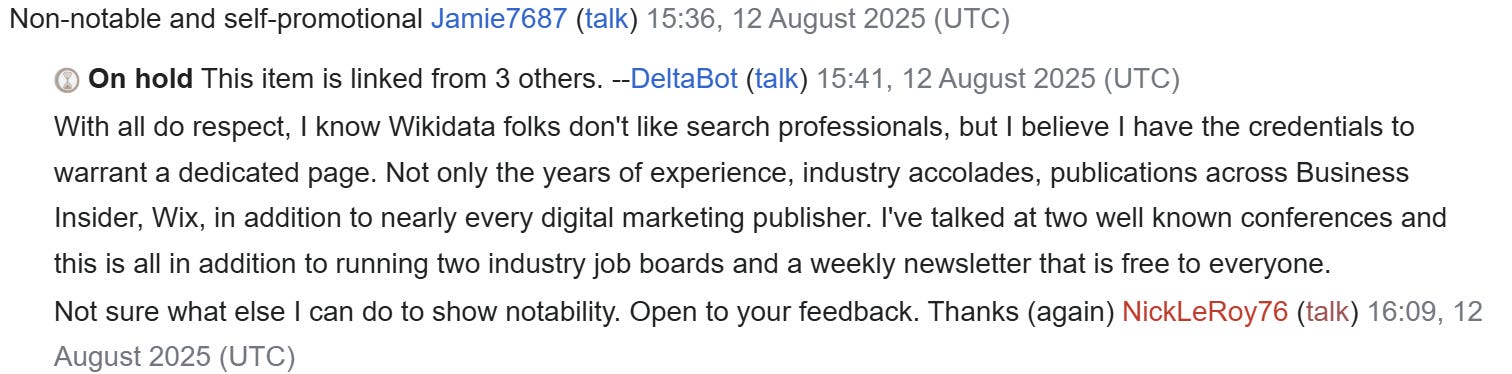 First, my entity page gets flagged as non-notable and self-promotional. I get the self-promotional angle, but let’s be honest: I could have paid a stranger to submit the exact same page, and no one would have known. Instead, I leaned into it and openly acknowledged I was an SEO, sent a direct note, and tried to engage in good faith.