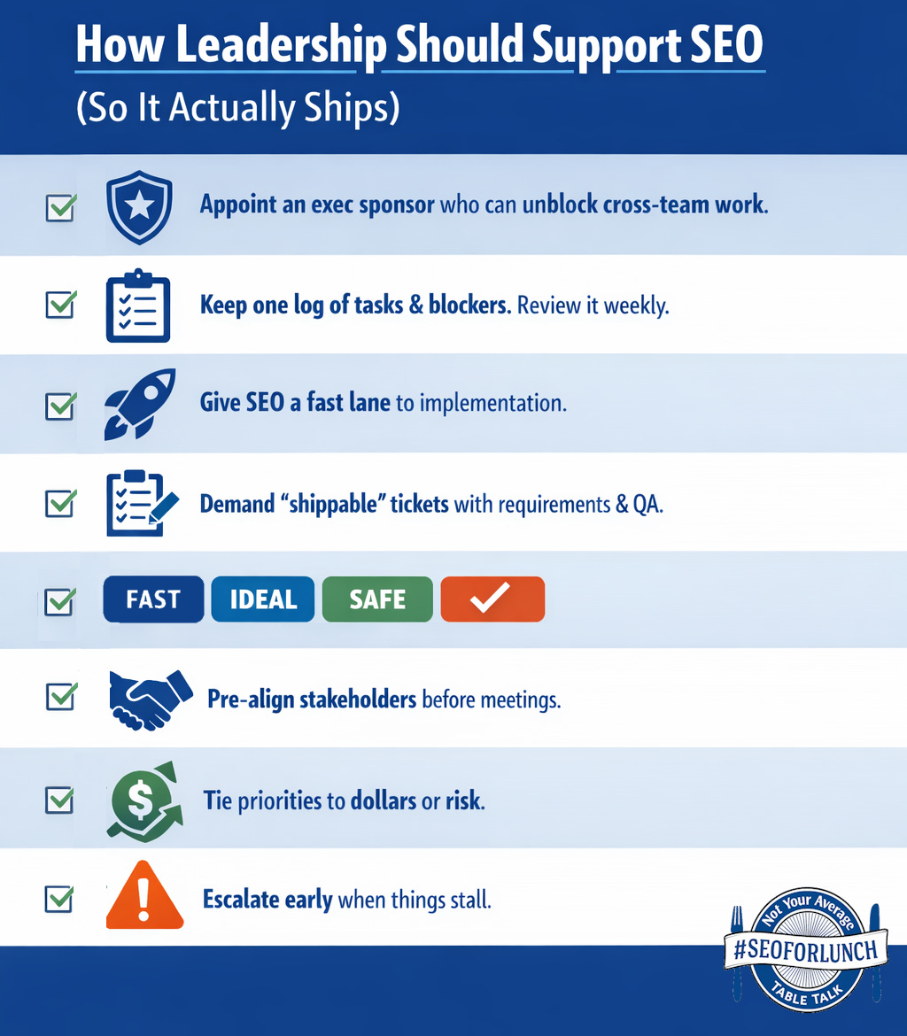 A good SEO anticipates the real blockers before they turn into excuses: legal reviews that take weeks, dev teams with no bandwidth, CMS limitations that make “simple” changes painful, brand feedback loops that never end, and stakeholder fear of change because someone broke something back in 2019.