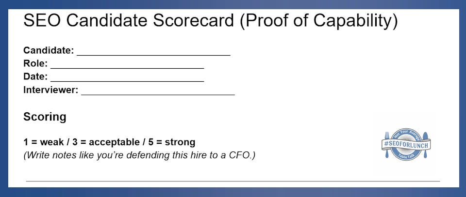 Communication test: Ask, “Explain this SEO concept to a CMO in five sentences.” If they can’t simplify, they can’t lead. This is one of the biggest differences between a junior IC and someone ready for senior or leadership responsibility.