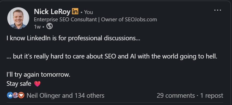Many times, we feel powerless in situations like these. Not everyone can support in person, and it can make us feel like we’re not supporting at all. This is my attempt to leverage my skills within SEO/AI and broader business to help others in need.
