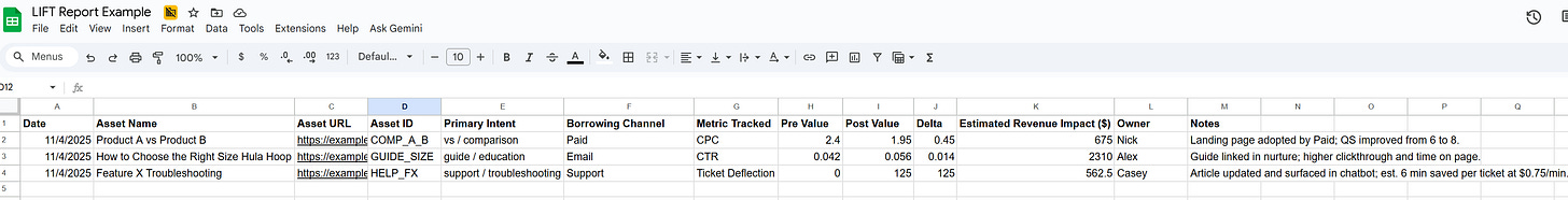 Lift Log columns: Date, Asset URL, Channel using it, Metric moved, Pre value, Post value, Delta, Estimated revenue impact, Owner.