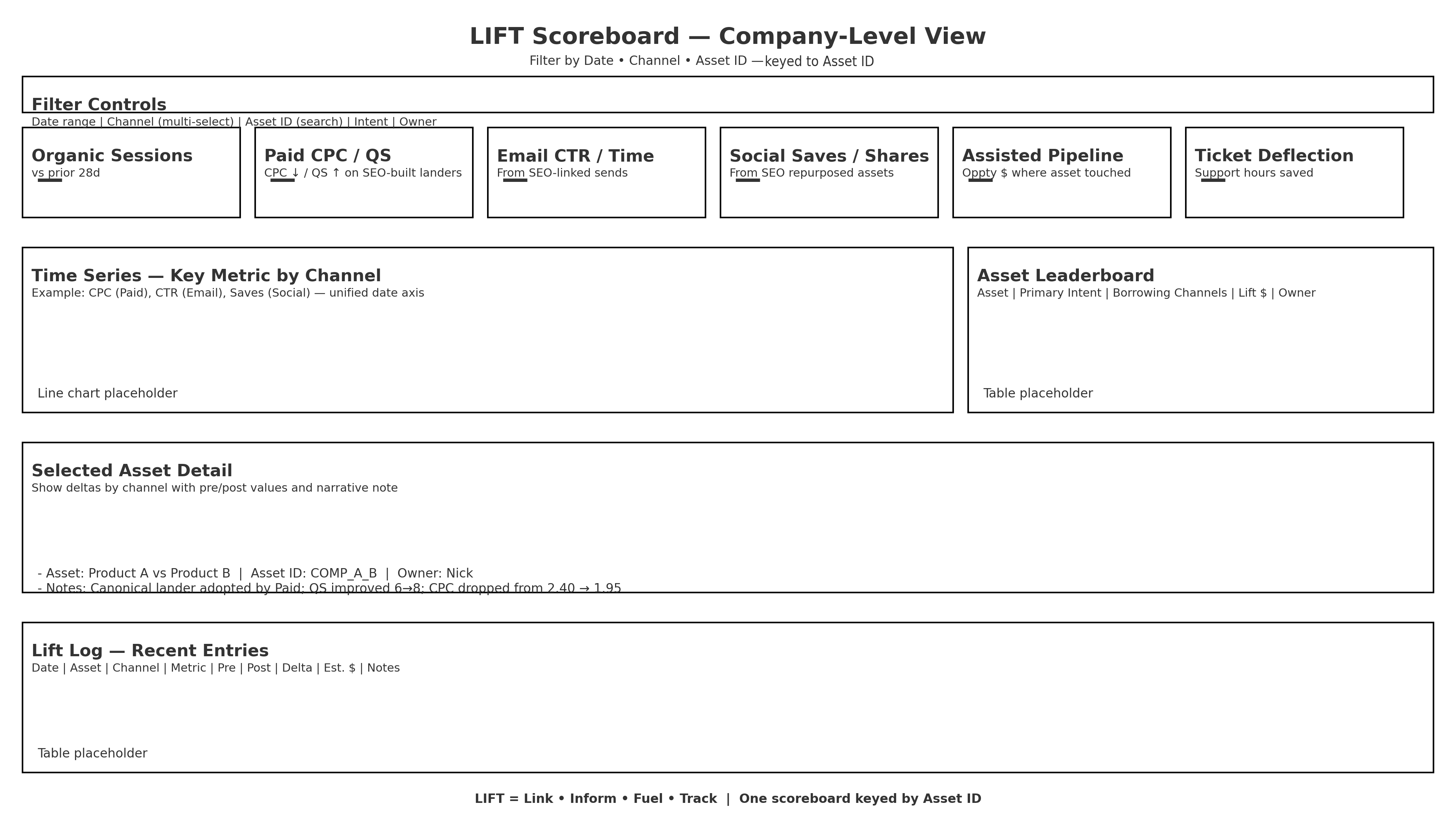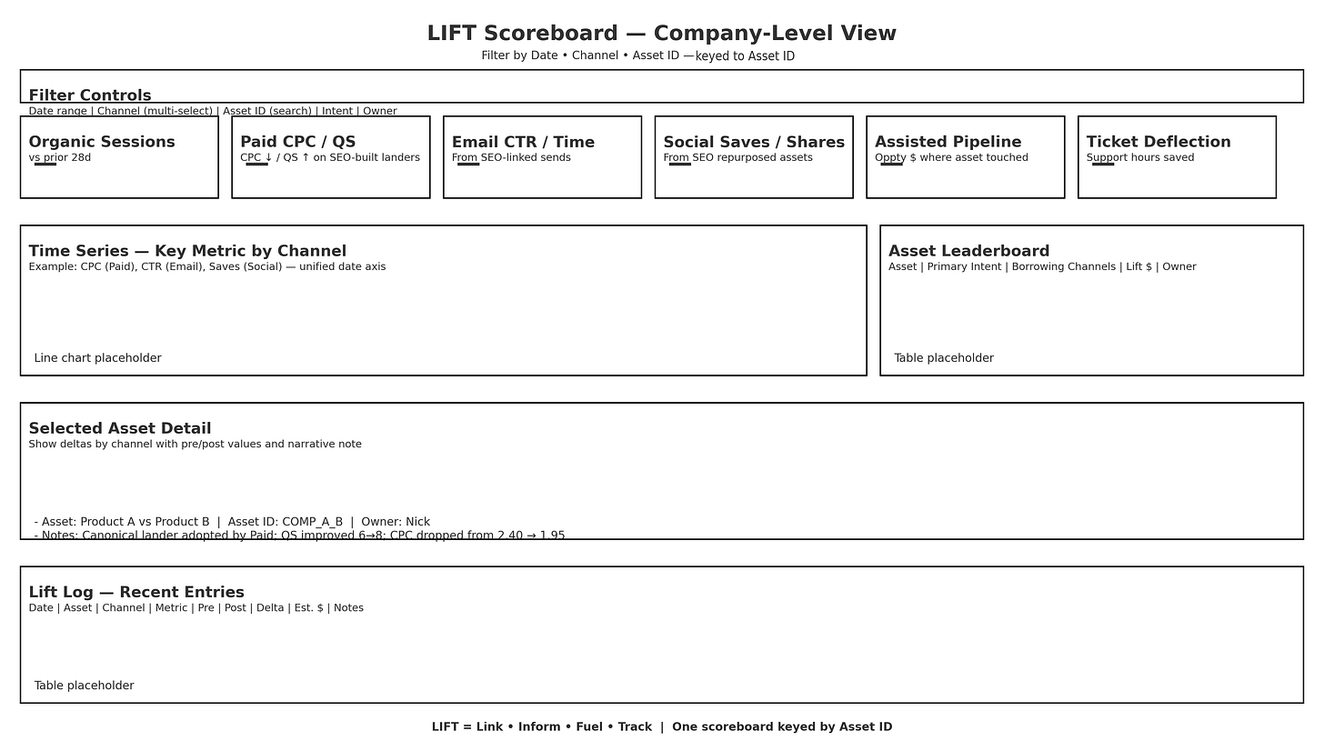 SEO lifts the whole company when it is planned, not lucked into. Use LIFT from day one so work is linked across teams, informed by research, fueled by reusable assets, and tracked on a single scoreboard.