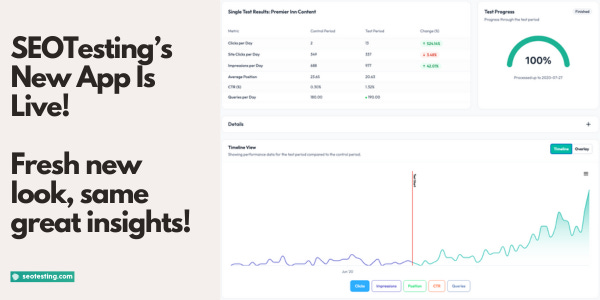 The new SEOTesting app brings your tests, annotations, dashboards, and content groups into one clean, decision-ready workspace. Instantly connect site changes to real performance movement, and show stakeholders clearer evidence of what worked.