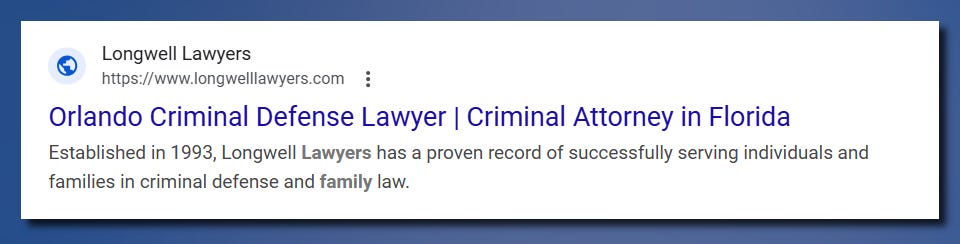Practice Area + Attorney + GEO1 | Practice Area modifier + Lawyer + GEO 2 | Practice Area similarity + GEO3.